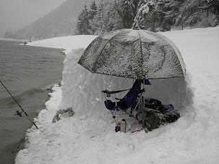 Die Kälte (immerhin minus fünf Grad) kroch langsam von Stunde zu Stunde unter unsere Wärmedämmung. Der stetige Wind am Südufer des Walchensees tat sein Übriges, so dass sich manche ihrer Survivaltaktiken besannen und sich die ersten Iglus bauten. Peter hat sein Camp richtig zur Festung ausgebaut (siehe unten...)